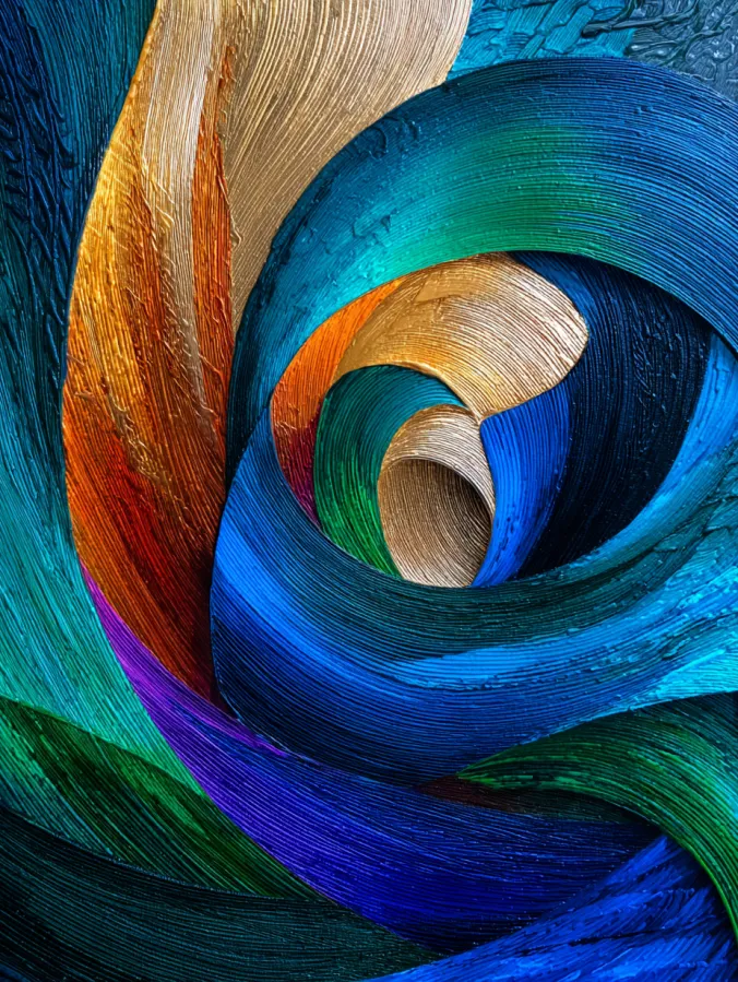This acrylic painting features bold ribbon like shapes that twist and curve across the canvas in a mesmerizing swirl. Rich shades of sapphire blue, teal, emerald green, and deep violet wrap around a glowing center, creating a sense of movement that pulls the eye inward. A striking burst of warm gold and copper adds contrast against the cooler tones, giving the composition extra depth and energy. Thick textured brush strokes follow the curves of each ribbon, leaving visible ridges in the paint that make the colors feel almost sculpted on the canvas.