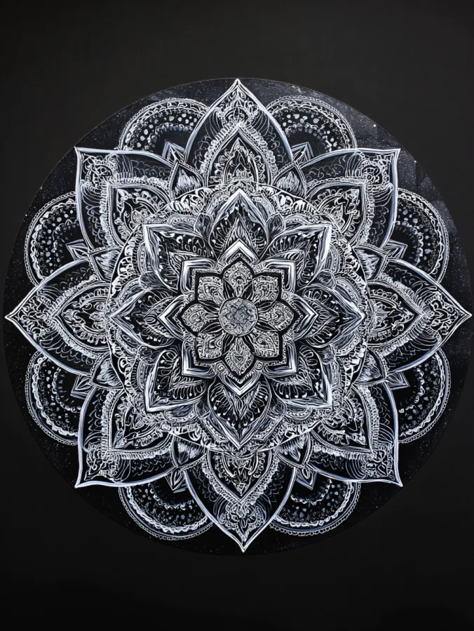 This black and white acrylic painting features a beautifully detailed mandala that spreads outward like a blooming flower across a dark circular canvas. Crisp white lines form layered petals, lace like textures, and delicate geometric patterns that radiate from the center. Each ring adds new shapes and tiny ornamental details, creating a rich tapestry of symmetry and rhythm. The bright white brushwork stands out sharply against the deep black background, giving the whole piece a glowing effect that feels both elegant and bold. Fine strokes, dotted accents, and curved motifs keep the eye moving across the canvas while the balanced circular layout keeps everything calm and harmonious.