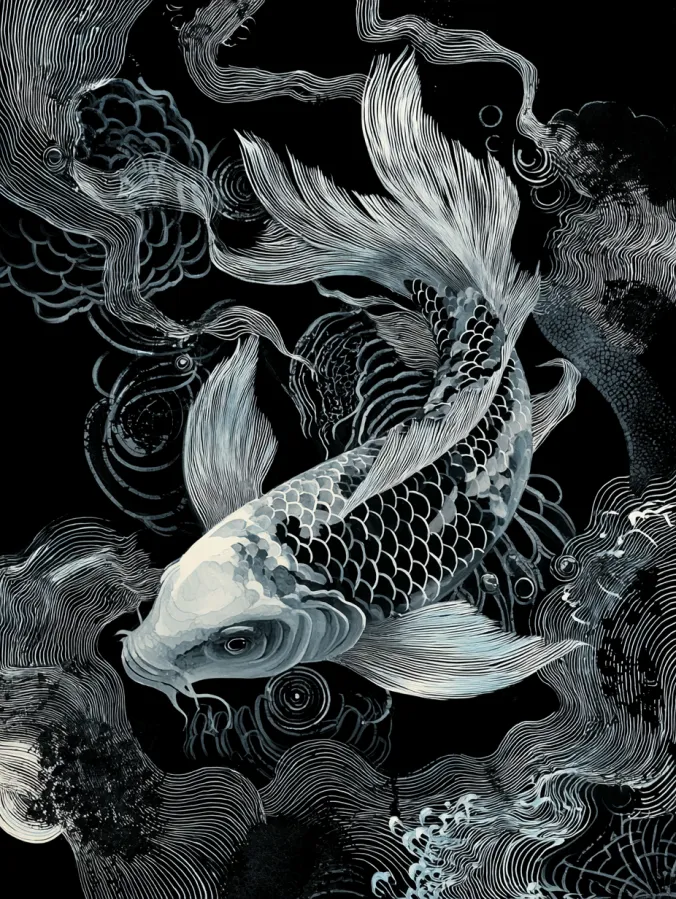 This black and white acrylic painting features a beautiful koi fish gliding through swirling water filled with elegant flowing lines. The fish sits at the center of the composition with soft gray shading across its scales that creates a gentle shimmer against the dark background. Each scale is carefully layered and highlighted which gives the body a smooth curved shape. Long delicate fins stretch outward like ribbons and blend into the surrounding waves. Around the fish, graceful line patterns twist and curl through the water which adds movement and rhythm to the entire painting. The deep black backdrop makes the bright white strokes and textures stand out in a bold and eye catching way.