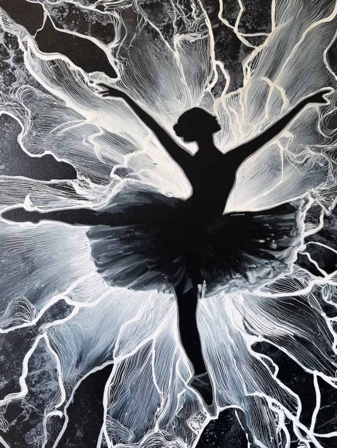 This black and white acrylic painting shows a graceful ballerina silhouette standing at the center of a burst of flowing light. The dancer is painted in deep black which creates a striking contrast against the bright swirling strokes surrounding her. Wide sweeping brush lines spread outward like glowing wings or petals, giving the whole piece a sense of motion and elegance. Fine white lines ripple through the background like electric currents or delicate threads of light. The dancer’s skirt fans out softly which adds balance to the energetic shapes radiating around her.