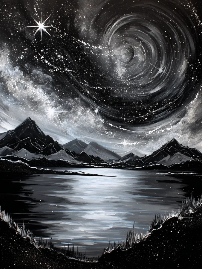 This black and white acrylic painting shows a peaceful mountain lake resting beneath a dramatic swirling night sky. Dark mountain silhouettes frame the horizon while the calm water reflects soft silver light from above. The real star of the scene is the sky. A spiral of cloudy white brush strokes twists across the night like a glowing galaxy. Tiny scattered stars sparkle across the dark background and create a dreamy cosmic atmosphere. Soft layers of gray clouds blend gently into the sky which gives the whole painting a sense of depth and quiet mystery.