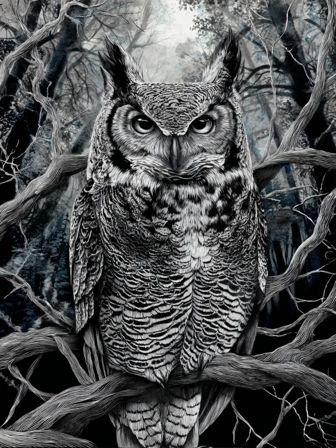 This black and white acrylic painting features a striking owl perched calmly on twisting tree branches deep in a shadowy forest. The owl sits at the center of the composition with its large eyes staring forward, creating a strong focal point that immediately draws attention. Detailed feather patterns cover the bird with layers of soft gray and white strokes that build texture and depth. The surrounding branches curl and weave around the owl which adds a natural frame to the scene. In the background faint trees and misty shadows create a mysterious woodland atmosphere that makes the owl feel like a quiet guardian of the forest.