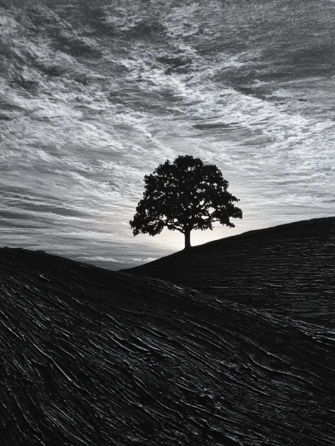This black and white acrylic painting features a single tree standing proudly on a gentle hill beneath a dramatic sky. The tree appears as a dark silhouette with delicate branches spreading outward like lace against the lighter sky behind it. Soft gray clouds stretch across the background and create a layered textured sky that feels vast and open. The hills below sweep across the canvas in smooth flowing curves with subtle brush strokes that suggest wind brushed grass. The contrast between the deep black foreground and the glowing sky gives the scene a quiet but powerful presence.