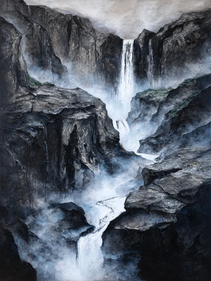 This black and white acrylic painting captures a dramatic waterfall rushing through a rugged canyon of towering rock walls. Tall cliffs frame the scene on both sides with textured brush strokes that create the look of rough stone surfaces and deep shadowed cracks. At the center a bright waterfall pours down from the upper cliffs and continues through a winding stream that disappears into the mist below. Soft layers of gray fog drift through the canyon which adds depth and mystery to the landscape. The contrast between the glowing water and the dark rock formations gives the entire composition a powerful and atmospheric feel.