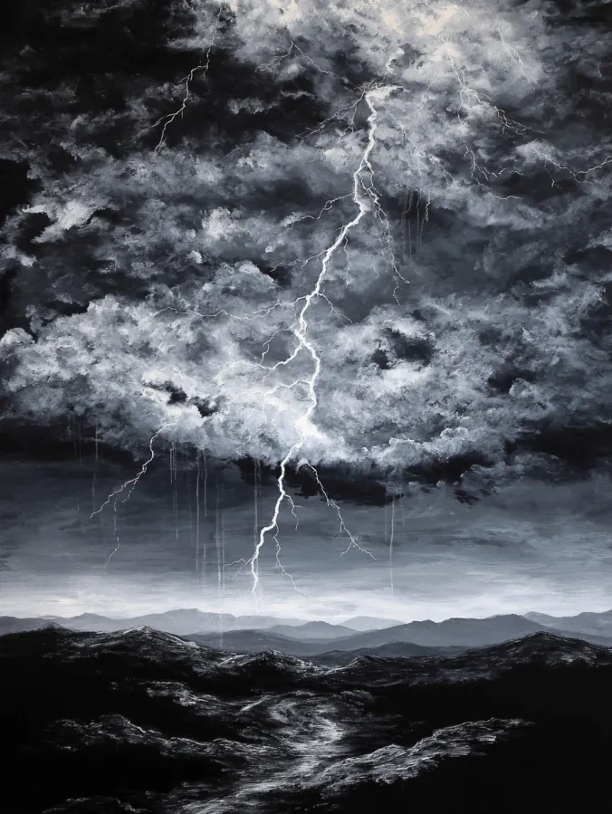 This black and white acrylic painting captures a powerful storm rolling across a rugged mountain valley. Thick layers of textured clouds fill the sky in swirling shades of charcoal, gray, and bright white. The centerpiece is a sharp lightning bolt slicing through the clouds from top to bottom. Fine branching streaks of light spread outward across the stormy sky. The clouds feel heavy and dramatic thanks to soft blended brushwork mixed with thicker strokes that create depth. Below the storm, dark mountain ridges fade gently into the distance while a winding river reflects faint light through the valley. The entire composition feels moody, bold, and cinematic.