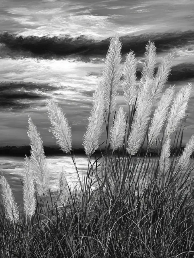 This black and white acrylic painting captures tall pampas grass swaying gently beside a calm lake. The feathery plumes glow in soft white tones while slender stems rise from a dense cluster of dark grasses in the foreground. Each plume is painted with light delicate strokes that create a fluffy texture and soft movement. Behind the grasses sits a peaceful lake that reflects the cloudy sky above. Layers of smoky gray clouds stretch across the horizon and add depth to the scene. The contrast between the bright grass plumes and the darker sky creates a beautiful balance that feels calm yet visually striking.