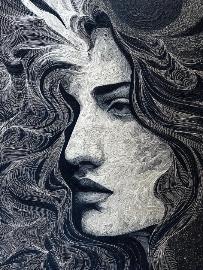 This black and white acrylic painting shows a graceful female portrait built almost entirely from flowing lines. The face appears in soft shades of white and gray while deep shadows shape the eyes, lips, and cheekbones. What really steals the spotlight is the hair. Long ribbon like strands swirl around the face in elegant waves that stretch across the canvas. Each strand is formed with fine curved brush strokes that create a sense of motion and texture. The result feels both detailed and fluid at the same time. The high contrast between dark shadows and bright highlights gives the portrait a dramatic and timeless look.