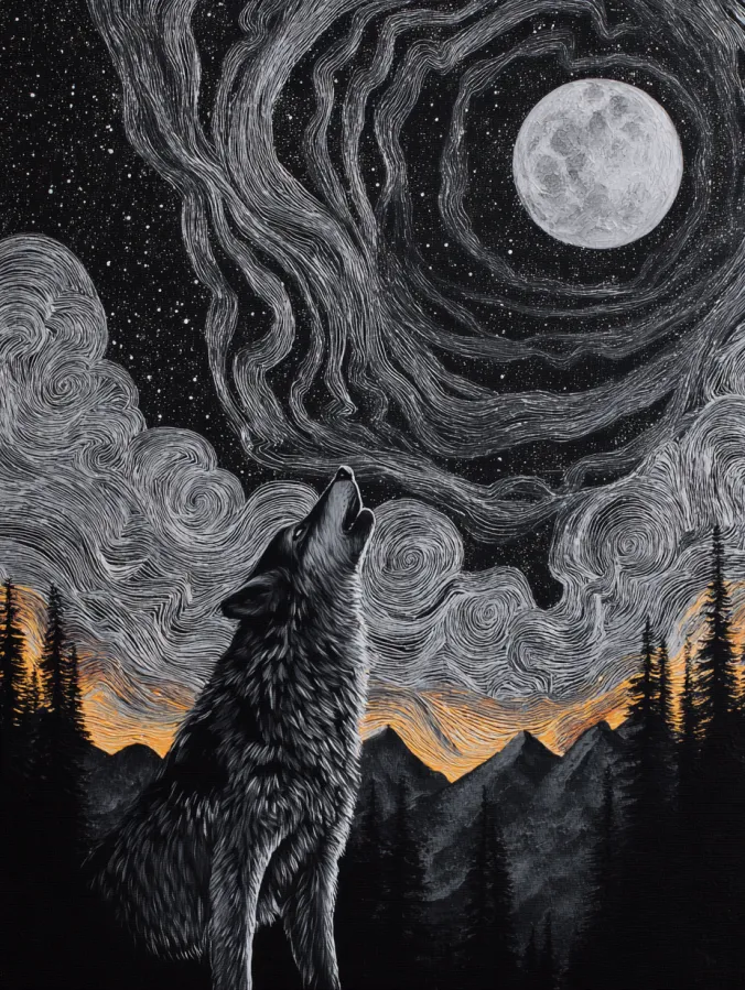 This black and white acrylic painting captures a lone wolf standing on a quiet mountain ridge while howling toward a glowing full moon. The wolf is painted with layered strokes of gray, charcoal, and white that give its fur a soft textured look. Behind it stretches a forest of dark pine silhouettes and distant mountains fading into the night. The sky becomes the true showstopper. Flowing spiral brush lines twist through the clouds and stars as they circle around the moon, almost like the wind itself is swirling through the night sky. The bright moon glows against the deep black background and pulls the whole composition together.