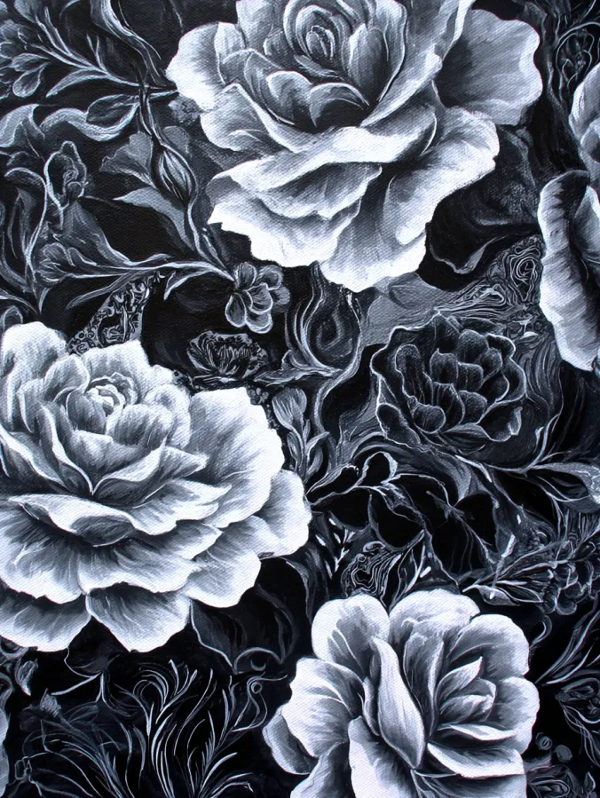 This black and white acrylic painting features a lush arrangement of blooming roses that fill the entire canvas with layered petals and winding leaves. Large roses open across the composition while smaller blossoms and delicate vines weave between them. Soft gray shading gives each petal gentle depth and makes the flowers feel full and velvety. Bright highlights along the edges of the petals glow against the deep black background which adds beautiful contrast. Fine brush strokes build the texture of every petal and leaf which creates a rich and slightly dramatic floral scene that feels both romantic and timeless.