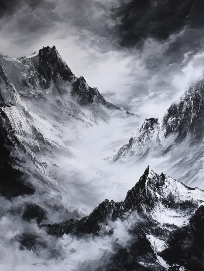 This black and white acrylic painting captures a powerful mountain landscape filled with towering peaks and swirling mist. Sharp rocky ridges rise from the foreground and lead the eye toward distant mountains fading into fog. Layers of gray and white create the look of snow clinging to the cliffs while darker shadows carve out the dramatic shapes of the rock. Soft blended brush strokes form drifting clouds and mist that wrap around the mountains and give the scene a mysterious mood. The sky above feels heavy and stormy which adds even more contrast to the bright snow covered slopes below.
