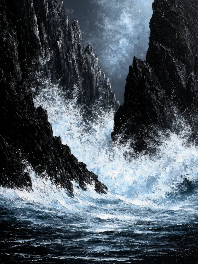 This black and white acrylic painting captures a dramatic moment where crashing ocean waves slam against towering rocky cliffs. Deep black rock formations rise sharply on both sides of the canvas and create a narrow channel where the water churns and explodes into white foam. Thick textured brush strokes build the powerful spray of the waves while softer blends form the restless surface of the sea below. The contrast between the bright foamy water and the dark jagged cliffs gives the whole painting a bold cinematic look. A cloudy gray sky above adds even more atmosphere and makes the scene feel wild and untamed.