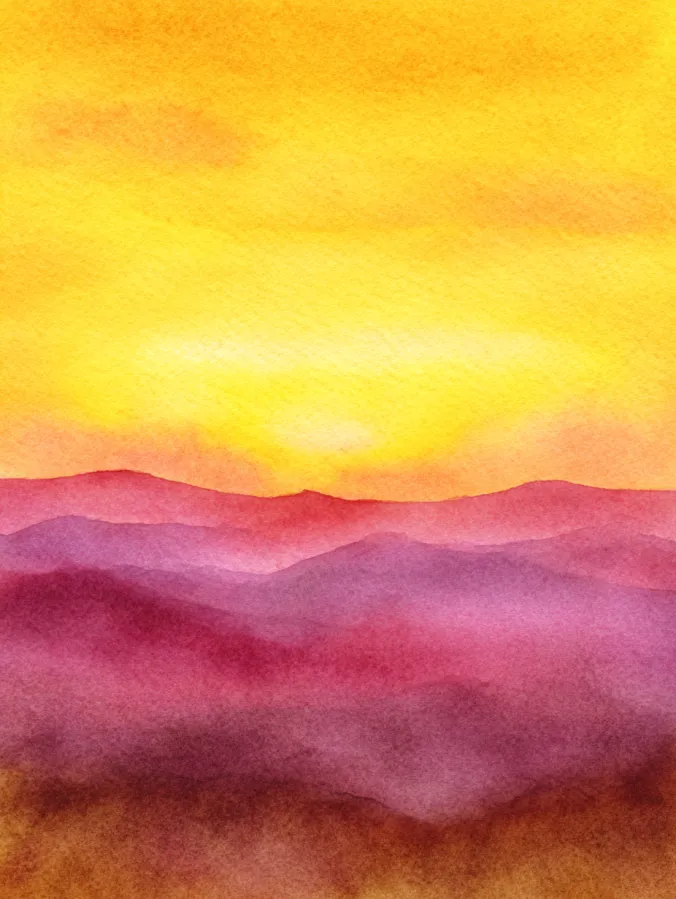 Layered Watercolor Mountains at Sunrise