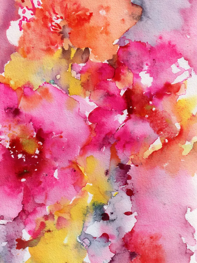 This watercolor painting is all about bold color and beautiful chaos. Bright pinks, warm reds, sunny yellows, and soft hints of gray blend and overlap across the page in loose organic shapes. The paint blooms naturally with uneven edges, splashes, and layered washes that give the whole piece energy and texture. There is no clear focal point, which makes the composition feel free and expressive, like the colors are dancing across the paper on their own terms.
