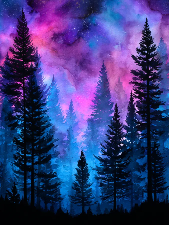 Enchanted Watercolor Forest Under a Night Sky