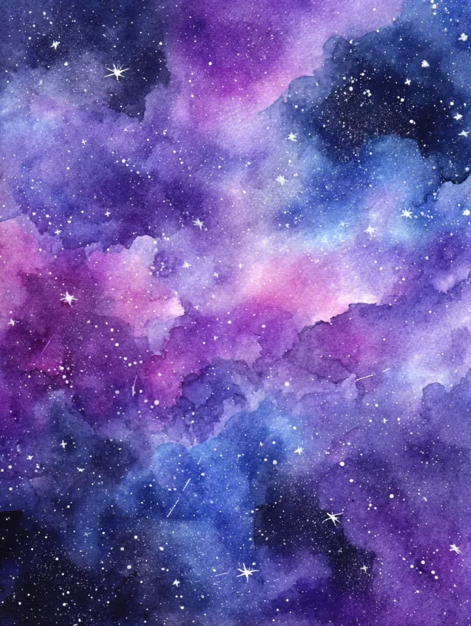 This watercolor painting captures a swirling galaxy sky filled with deep purples, indigo blues, and soft pink clouds drifting across the page. The colors blend seamlessly in layered washes, creating a sense of depth and movement without any harsh lines. Tiny white stars are scattered throughout the scene, some softly speckled and others slightly brighter, giving the sky a magical, floating feel. The overall layout feels expansive and immersive, like looking up into an endless night sky.