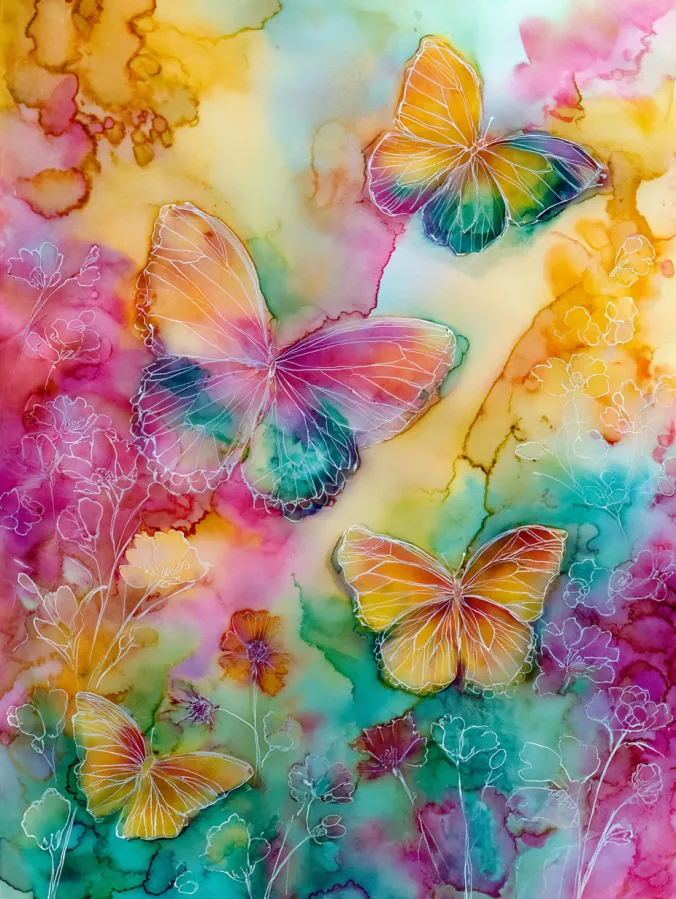 This watercolor painting is filled with softly glowing butterflies drifting across a dreamy, color soaked background. Warm yellows, coral pinks, teal greens, and gentle purples blend together in loose washes that feel airy and light. The butterflies are defined with delicate white line details that give them a graceful, almost magical look without feeling heavy. Floral outlines weave through the background, adding subtle movement and depth while keeping the whole composition fluid and balanced.