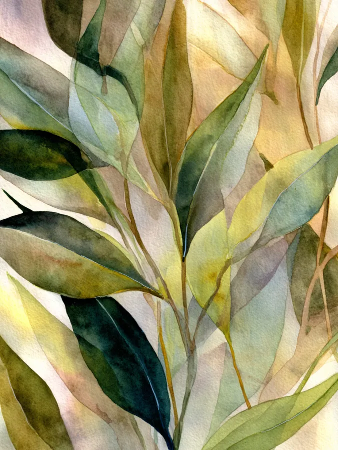 This watercolor painting features tall overlapping leaves painted in gentle shades of olive green, sage, muted teal, and warm golden tones. The leaves are long and flowing, layered with translucent washes that allow colors to softly show through one another. Brush strokes feel light and fluid, with delicate edges and subtle veins hinted through thin lines. The background stays softly blended and neutral, helping the leafy shapes fill the frame without feeling busy or crowded.