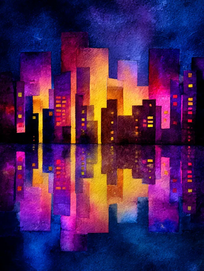 Bold Watercolor City Skyline With Reflections