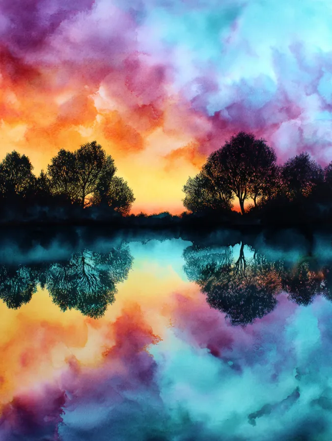 This watercolor painting captures a glowing sunset sky reflected perfectly across calm water, creating a soft mirror effect through the center of the composition. Warm oranges and golden yellows melt into purples, pinks, and cool turquoise tones, all blended with loose cloud like brush strokes. Dark tree silhouettes line the horizon and repeat below in the reflection, grounding the colorful sky and adding contrast. The overall layout feels balanced and peaceful, with the water acting as a gentle pause between the two halves of the scene.