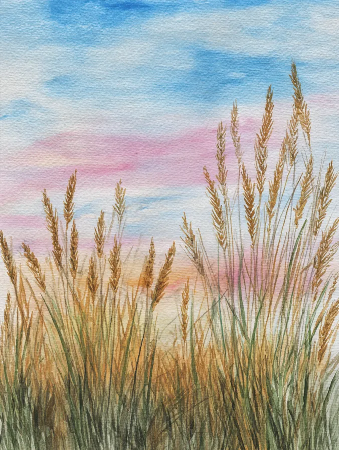 This watercolor painting features tall meadow grasses reaching upward against a soft pastel sky. Wispy strokes of gold, olive, and muted green layer together to create natural movement, while the sky blends light blues, blush pinks, and warm hints of peach. The brushwork feels loose and airy, letting individual blades overlap without sharp edges. The composition stays simple and vertical, allowing the grasses to sway across the page and keep the focus calm and uncluttered.