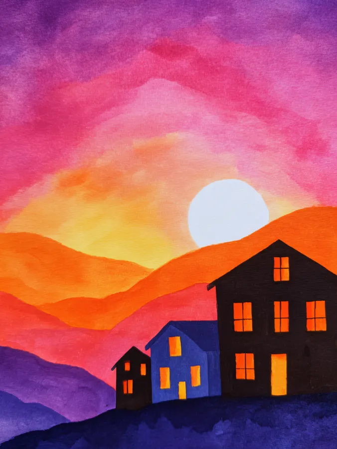 This watercolor painting shows a small cluster of houses resting against rolling hills under a glowing sunset sky. Warm layers of orange, coral, pink, and violet blend smoothly across the sky, creating a soft gradient that feels warm and dreamy. The houses are painted as simple dark silhouettes with glowing yellow windows that instantly draw the eye. Loose brush strokes and gentle color transitions keep the scene relaxed while the layered hills add depth without feeling busy.