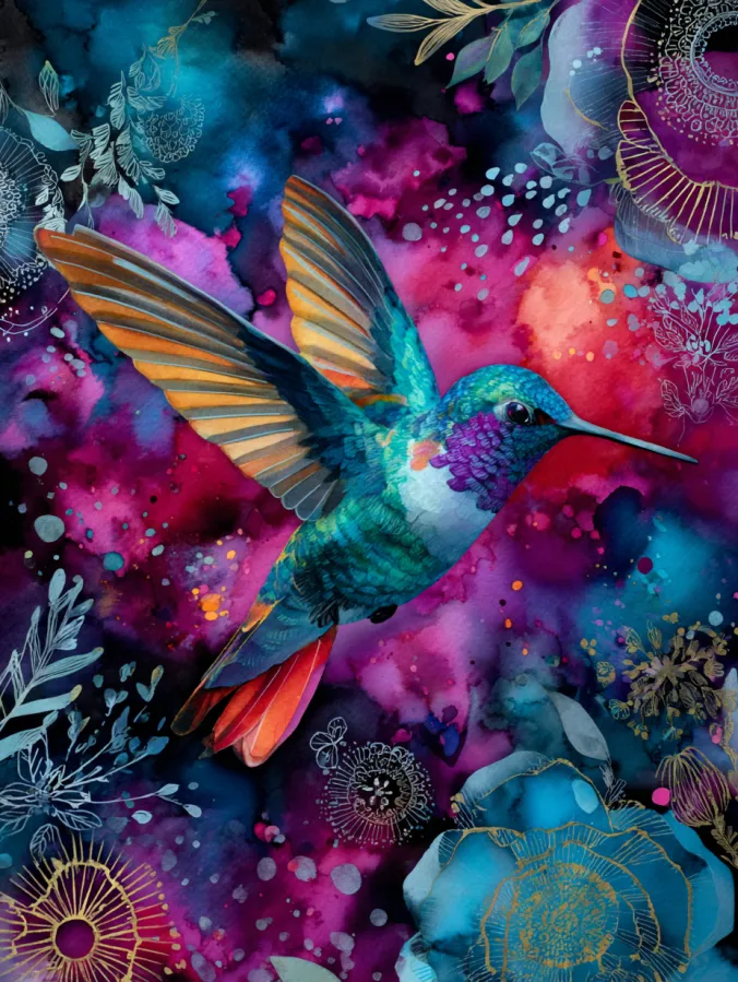 This mini watercolor painting features a luminous hummingbird mid flight with wings stretched wide and feathers glowing in shades of teal, turquoise, coral, and gold. The background feels like a magical color explosion with rich pinks, purples, and deep blues blending together in soft washes and dramatic blooms. Delicate floral line details float around the bird and add a whimsical touch without stealing focus. The brush strokes feel loose yet intentional, with layered textures and flowing edges that give the whole piece a lively and expressive energy.