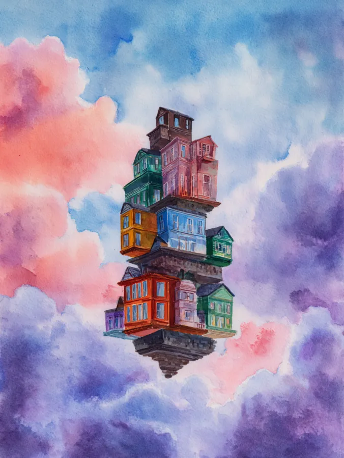 This mini watercolor painting shows a stack of colorful houses balanced gently in the sky, surrounded by soft clouds in shades of lavender, pink, and pale blue. Each house is painted in a different bright tone like teal, mustard, coral, and green, which makes the whole composition feel playful and lively. The brush strokes are loose in the clouds and more defined on the houses, creating a nice contrast between softness and structure. Everything feels light and dreamy, with the floating arrangement pulling the eye upward and keeping the scene feeling whimsical.