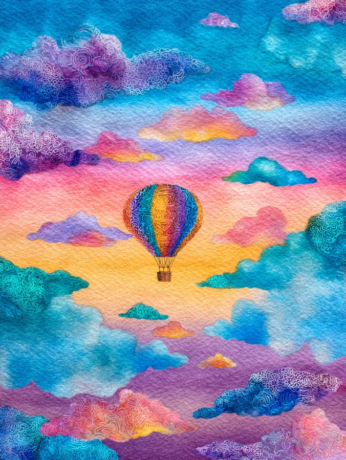 Colorful Hot Air Balloon Among Dreamy Clouds