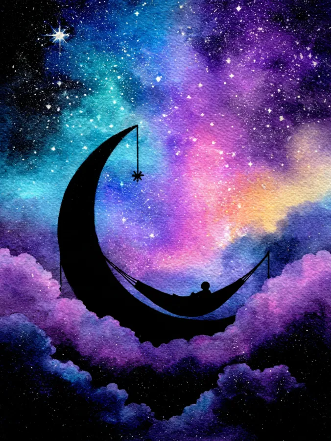 This mini watercolor painting shows a dreamy night sky filled with blended purples blues and soft golden tones that glow like distant stardust. A bold crescent moon curves through the center holding a tiny hammock with a peaceful silhouette resting inside. The clouds below are painted in fluffy layered washes that add depth while keeping the scene soft and calm. Fine splatters and gentle textures bring the stars to life and make the whole composition feel magical and soothing.