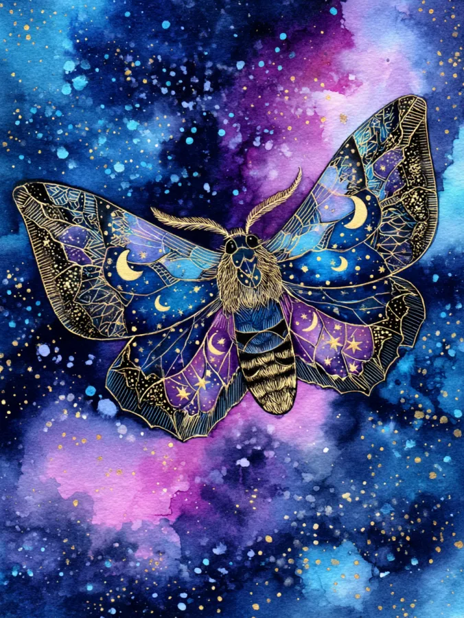 This mini watercolor painting features a beautifully detailed moth floating against a deep cosmic background filled with blues purples and soft pinks. The wings are decorated with tiny moons stars and delicate gold line details that give the whole piece a magical glow. Loose watercolor washes create a dreamy galaxy effect while splatters and texture add depth and movement. The moth is centered and symmetrical which makes the composition feel balanced and calm while still being eye catching.
