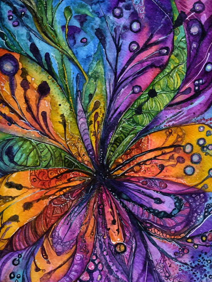 This mini watercolor painting explodes with vibrant petals radiating outward from a dark center, filled with rich purples, fiery oranges, sunny yellows, and cool greens. The brush strokes feel energetic and layered, with loose washes blending into bold lines and playful splatters. Organic shapes overlap and twist, creating movement and depth while tiny dots and textures add extra visual interest. The composition feels full and lively, like a flower imagined through pure color and emotion rather than realism.