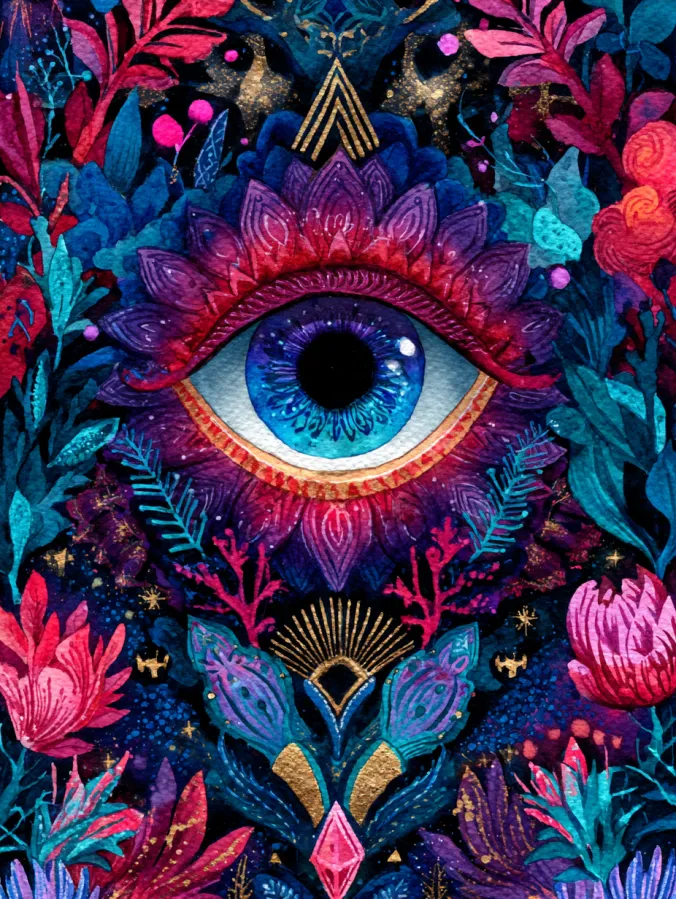 This mini watercolor painting centers on a striking blue eye framed by layers of bold florals and leafy shapes in rich purples teals pinks and deep blues. The composition feels symmetrical and balanced with petal like forms radiating outward and delicate gold accents adding a soft glow. Brush strokes move between loose washes and detailed line work which gives the piece depth and texture. Everything feels lush and magical with colors blending smoothly while still keeping crisp shapes that pull the eye inward.