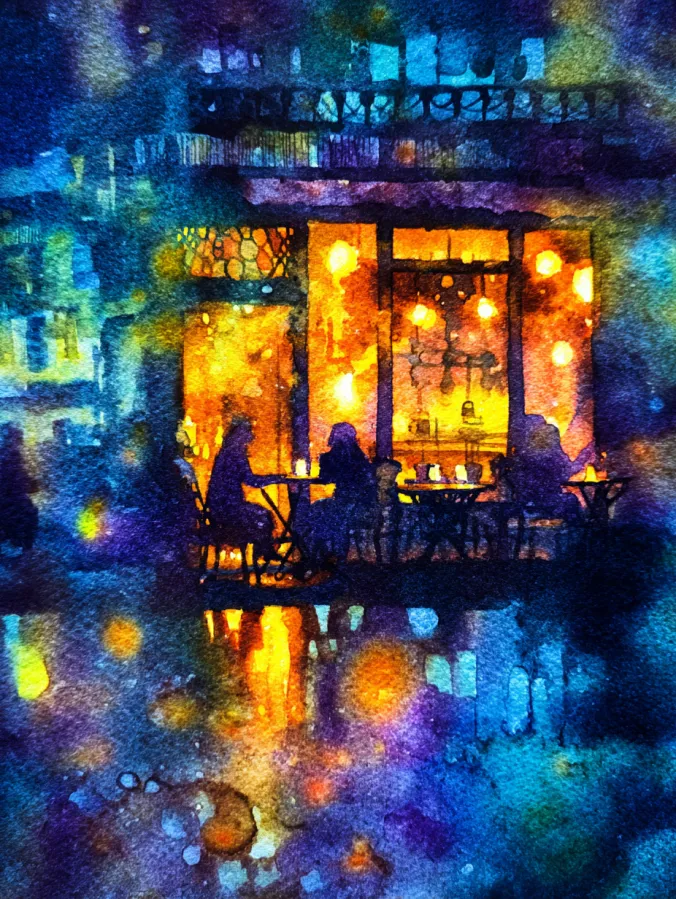 This mini watercolor painting captures a warm café scene glowing against a moody blue and purple night. Golden light spills from the windows and reflects softly on the surrounding streets, creating a dreamy atmosphere full of color and texture. Loose washes blend together with scattered blooms and splatters that make the lights feel alive and slightly blurred. The silhouetted figures sitting at tables add a quiet story to the scene while keeping the overall composition relaxed and inviting.