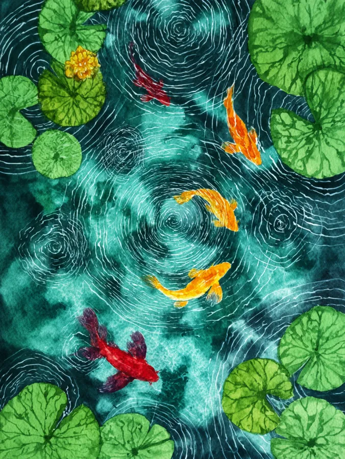 This mini watercolor painting shows a peaceful koi pond viewed from above with swirling water patterns and soft ripples flowing across the surface. Rich teal and deep green tones blend together in loose washes while delicate white line details trace the movement of the water. Bright orange and red koi fish glide gently through the scene and stand out beautifully against the cool background. Rounded lily pads frame the composition and add balance while keeping the layout calm and harmonious.