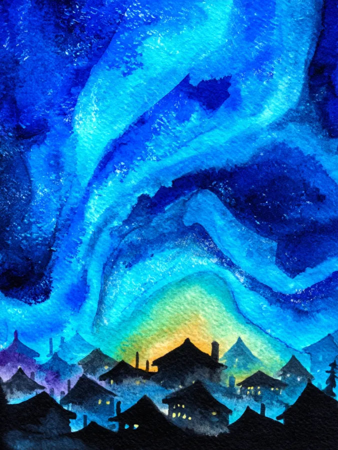 This mini watercolor painting shows a quiet village of dark silhouetted rooftops resting beneath a dramatic sky painted in layers of deep blues, turquoise, and glowing hints of green and yellow near the horizon. The brush strokes in the sky feel bold and sweeping, almost like waves of color rolling across the paper. Soft textures and watercolor blooms give the scene a dreamy mood, while tiny glowing windows add warmth and balance to the cool tones above. The composition feels cozy at the bottom and expansive at the top, which makes the whole piece feel magical and peaceful at the same time.