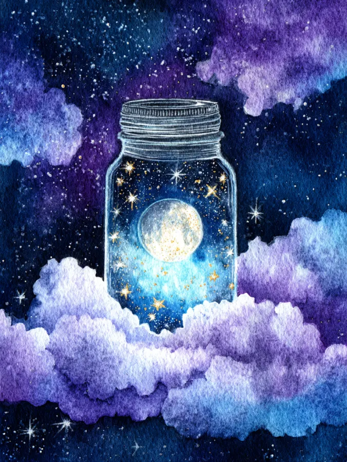 This mini watercolor painting shows a glowing moon tucked inside a glass jar, surrounded by soft clouds and a deep star filled sky. Rich indigo purples and midnight blues blend together in loose washes while tiny white and gold speckles create a dreamy starry effect. The jar is outlined with delicate lines that keep it light and airy without feeling heavy. The composition feels cozy and magical, with the moon softly illuminating the space around it.