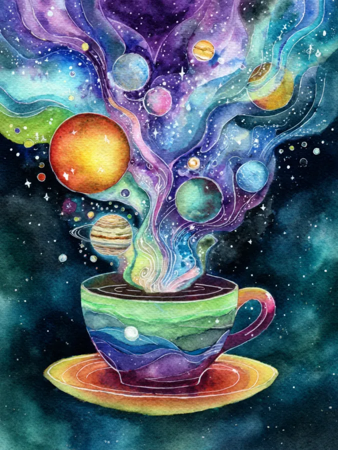 This mini watercolor painting shows a colorful tea cup sitting in space with swirling steam transforming into planets stars and flowing cosmic shapes. Rich purples blues greens and warm oranges blend together in soft washes that feel dreamy and playful. The cup is painted with layered rainbow tones while the steam rises in loose curving strokes that guide the eye upward. The composition feels balanced and imaginative with tiny celestial details scattered throughout the background.