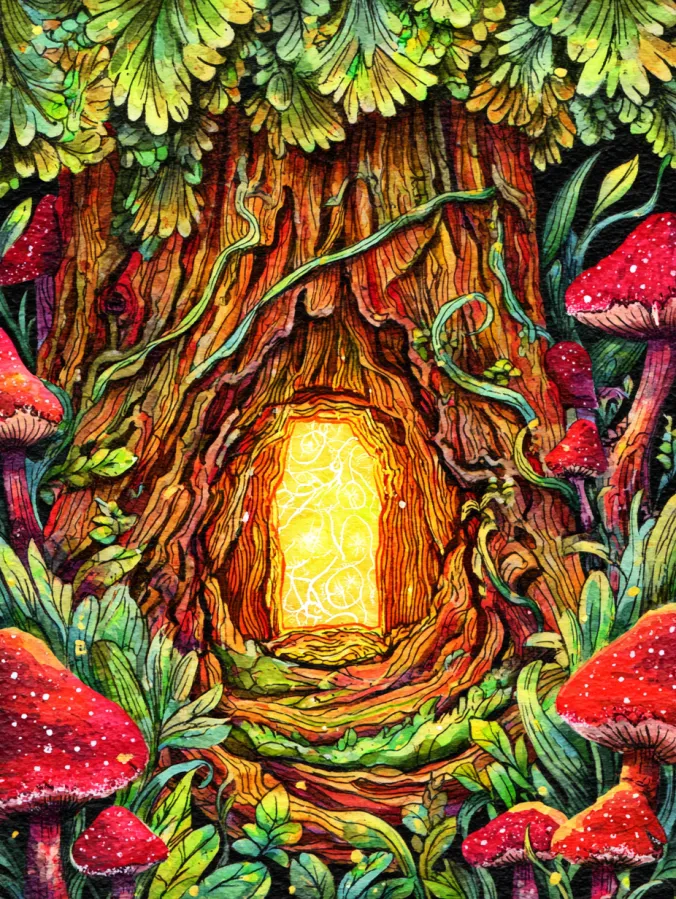 This mini watercolor painting shows a glowing doorway tucked into the trunk of a massive tree, surrounded by lush leaves curling vines and bright red mushrooms. Warm golden light spills from the opening and contrasts beautifully with the deep greens and rich earthy browns of the bark. The brush strokes feel layered and expressive, especially in the wood grain and foliage where fine lines and loose washes work together. The composition pulls you straight toward the center and makes the whole scene feel magical and inviting.