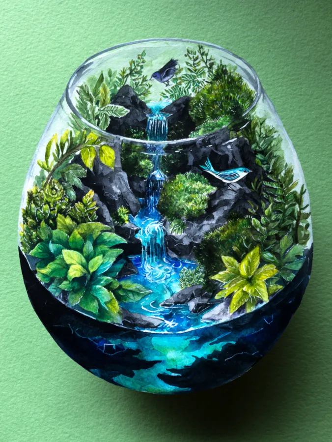 This mini watercolor painting shows a glass bowl terrarium filled with layered greenery, dark rocky textures, and a bright cascading waterfall flowing through the center. Lush greens pop against deep charcoal stones, while the water glows in fresh blues and teals with soft highlights that feel almost luminous. The brush strokes are detailed yet fluid, especially in the leaves and water where gentle blends and small flicks add movement. The rounded glass shape frames the entire scene beautifully and makes the composition feel cozy, balanced, and full of tiny discoveries.