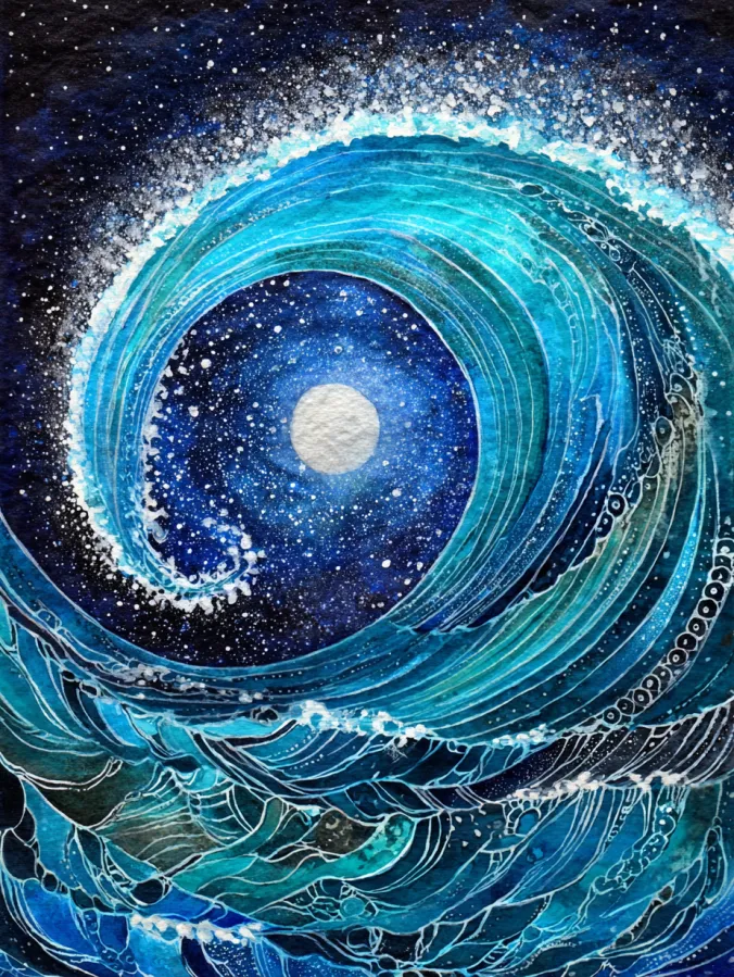 This mini watercolor painting features a powerful curling wave shaped into a dramatic spiral, wrapping around a glowing full moon at the center. Rich blues, teals, and hints of turquoise layer together with splashes of white that feel like sea spray frozen in motion. Fine line details trace the movement of the water and add texture without overwhelming the scene. The composition pulls the eye inward toward the moon while the surrounding starry sky adds depth and a dreamy night time mood.