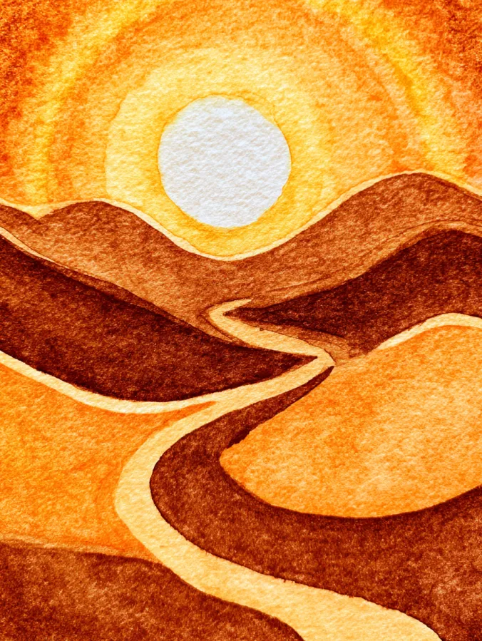 This mini watercolor painting shows a glowing desert landscape with rolling hills layered in rich shades of amber, rust, and golden brown. A soft winding path curves gently through the center and leads the eye toward a bright sun resting low in the sky. The brush strokes feel smooth and blended, with subtle texture from the paper adding warmth and depth. The composition is simple but intentional, using flowing shapes and color gradients to create a calm and inviting scene that feels perfectly balanced.