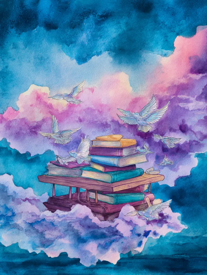 This mini watercolor painting shows a stack of colorful books resting on soft clouds with gentle birds flying all around them. The background blends dreamy blues pinks and purples with loose flowing brush strokes that feel light and airy. The books are painted with warmer tones and soft shading which helps them stand out while still feeling part of the sky. The composition feels balanced and magical with movement created by the birds and layered clouds that give the scene depth without feeling busy.