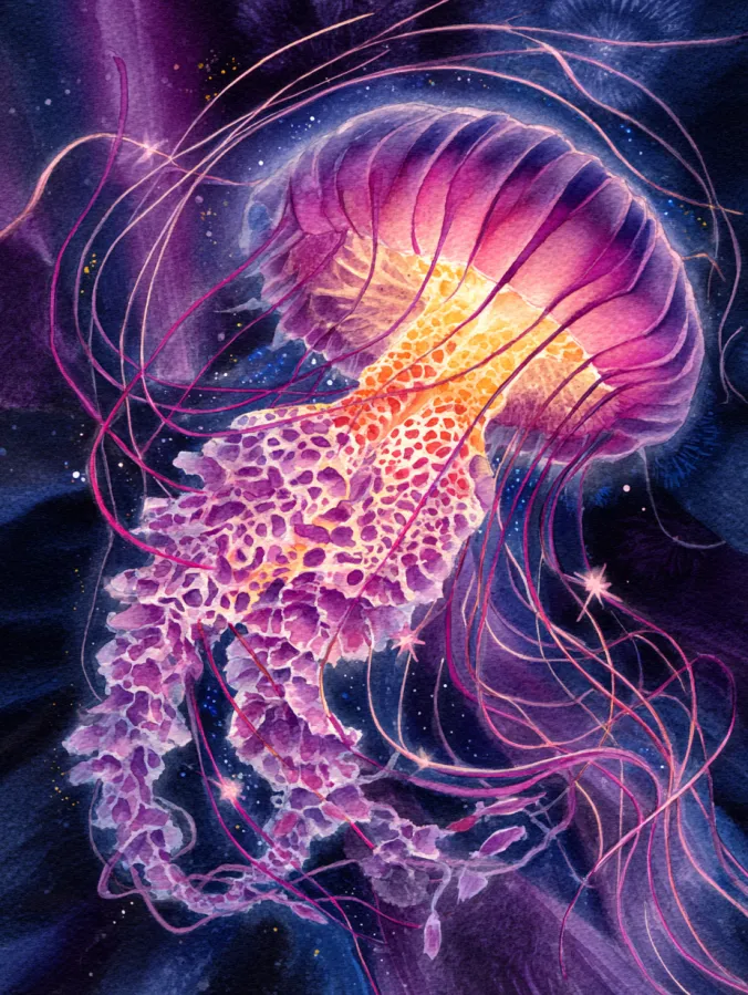 This mini watercolor painting captures a luminous jellyfish drifting through a deep dreamy ocean that feels almost like outer space. Rich purples pinks and warm golden tones glow from the center of the jellyfish while cool blues and indigo shades swirl softly in the background. The brush strokes are fluid and layered with delicate line details in the tentacles that add movement and elegance. The composition feels airy and flowing with the jellyfish centered and gently floating through a star speckled underwater scene.