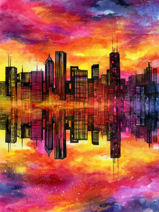 This mini watercolor painting shows a bold city skyline mirrored perfectly below as if resting on still water. The sky explodes with saturated oranges pinks purples and golden yellows that blend together in loose expressive washes. Dark building silhouettes with fine ink like details cut through the color and give the scene structure and contrast. The reflection repeats the skyline in a slightly softened way which adds depth and makes the whole composition feel dramatic and balanced.